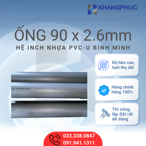 Ống 90 x 2.6mm PN6 nhựa PVC-U hệ Inch mở rộng Bình Minh là dòng ống nhựa cao cấp được sản xuất từ nhựa PVC không hóa dẻo, nổi tiếng với độ bền cơ học cao, khả năng chịu áp lực tốt và tính kháng hóa chất vượt trội.